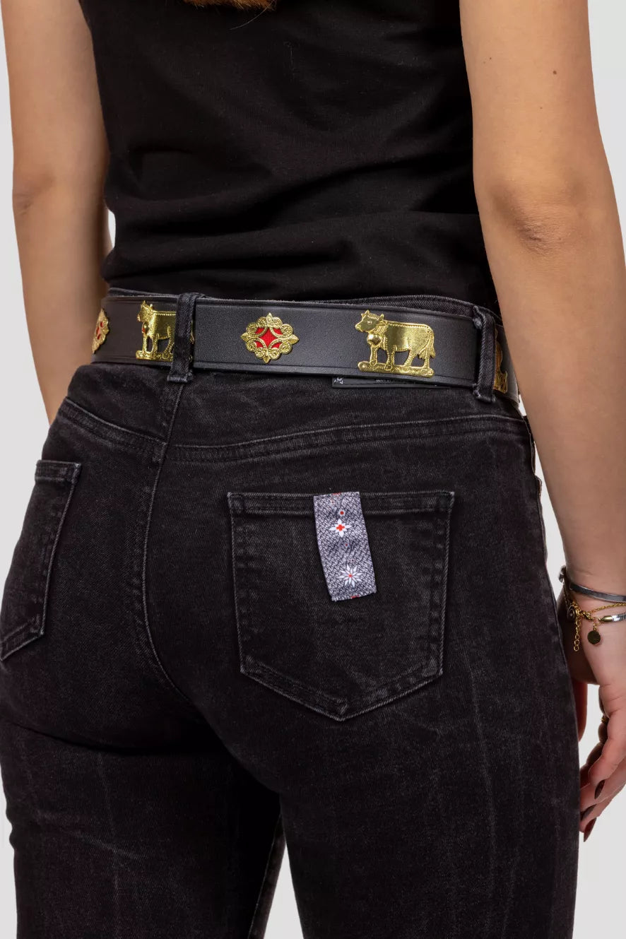 Dieser Trachten Gürtel (Chüeligurt) mit goldenen Details ist ein absoluter Blickfang: perfekt für den Alltag, als Trachtengürtel für Feste, zu besonderen Anlässen oder als elegantes Accessoire zu deinem modernen Outfit.