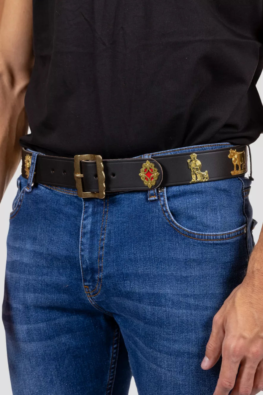 Der Appenzeller-Gürtel in edlem Schwarz verbindet traditionelle Schweizer Trachtenornamente mit einer modernen Note. Die goldfarbenen Metallornamente machen dieses Accessoire zu einem echten Highlight und vereinen Schweizer Handwerkskunst mit zeitlosem Stil.